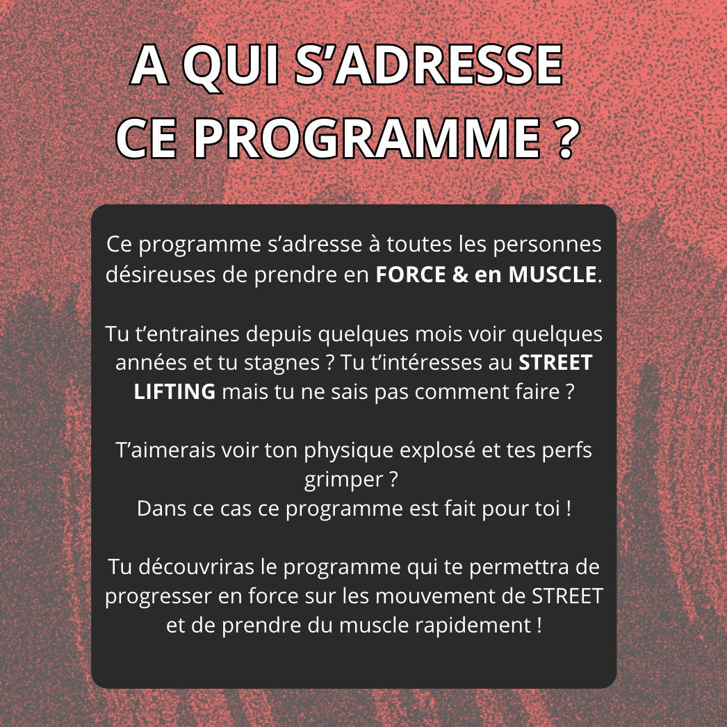 Tu découvriras à travers ce programme, 5 semaines d'entraînement basé sur la programmation en STREET LIFTING et MUSCU. L'idée est de progresser sur les perfs en STREET LIFTING et DÉVELLOPPER SON PHYSIQUE.